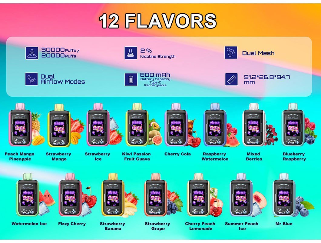 Beyond its innovative features, the Airmez Matrix invites you to explore a curated collection of 12 exceptional flavors. Each profile has been meticulously crafted to awaken your taste buds and elevate every moment of your vaping journey, whether you’re taking a quick break or settling in for a longer session. It’s more than a device—it’s an experience designed to surprise, satisfy, and accompany you through every part of your day.
