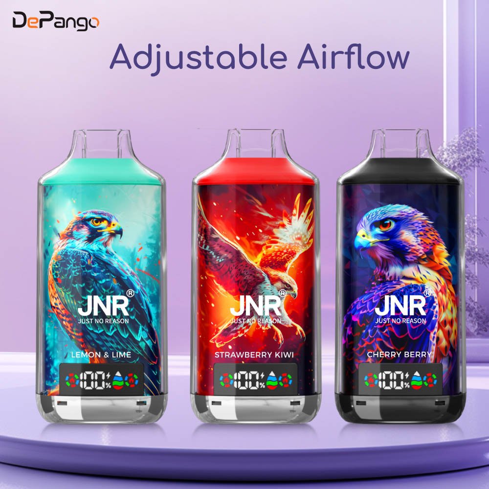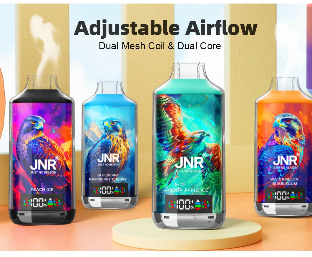 In terms of performance, the JNR Falcon X 18000 Puffs truly excels. The dual mesh coils ensure even heating for reliable vapor production and satisfying cloud density. An adjustable airflow system lets you personalize the draw, from a tighter mouth-to-lung feel to a more open direct-lung inhale. Backed by a dependable 950mAh battery and quick Type-C recharging, it’s designed to keep up with all-day vaping needs. Third-party lab tests further verify its consistent performance and adaptability, making it a versatile option for vapers of all experience levels.
