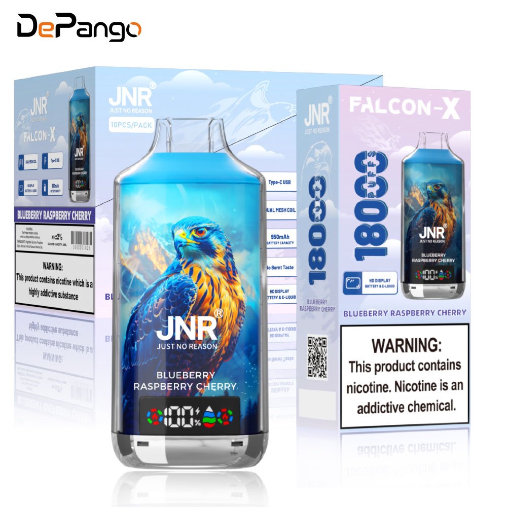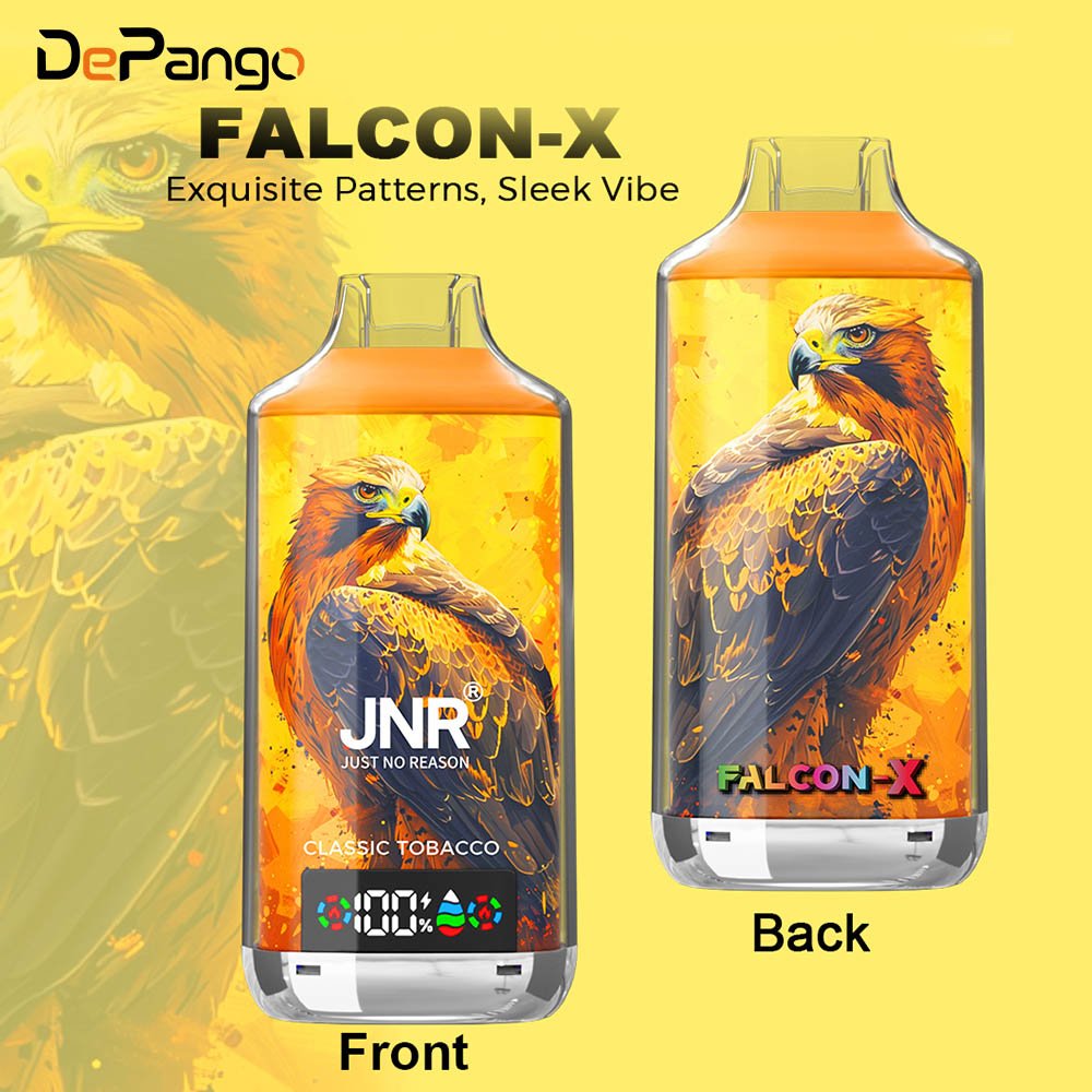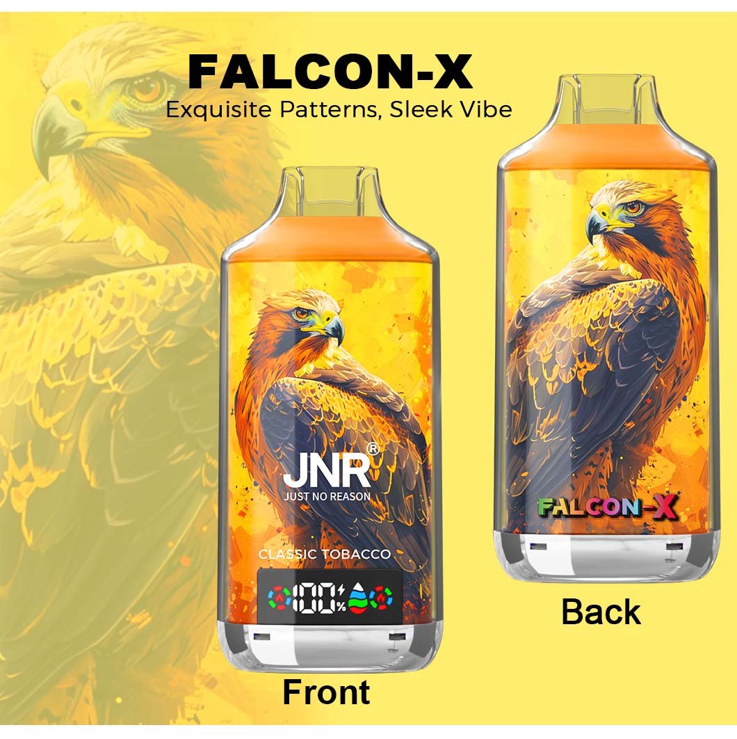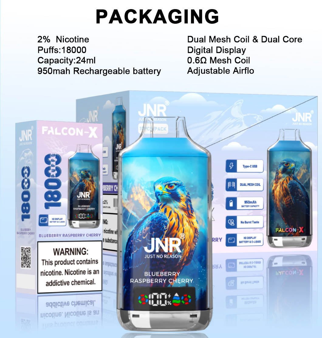 The JNR Falcon X 18000 Puffs Disposable Vape is the perfect choice for users who value long-lasting performance and reliable quality. Offering an impressive capacity of up to 18,000 puffs, it far exceeds the lifespan of most ordinary disposable e-cigarettes, allowing you to enjoy extended vaping sessions without the need for constant replacement. Highly recommended by our team of vaping experts with more than ten years of industry experience, this device is celebrated for its powerful and steady output. Featuring advanced dual mesh coil technology, it generates exceptionally smooth vapor and rich, consistent flavor—making it a great fit for both beginners and experienced vapers alike.