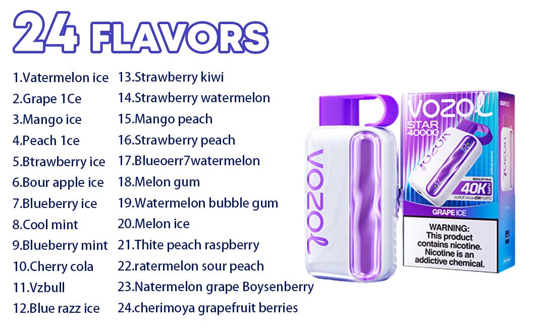 Designed for comfort and style, its sleek and ergonomic shape ensures a pleasant grip, while the integrated LED display adds a modern, practical touch by clearly monitoring your puff count and battery status in real time. Filled with premium-quality e-liquid, the Vozol Star 40K maintains rich, full-bodied flavor from the very first puff until the last. Whether you prioritize extended taste retention or unwavering performance, this device proves to be a dependable companion throughout your vaping journey, delivering satisfaction and reliability with every use.